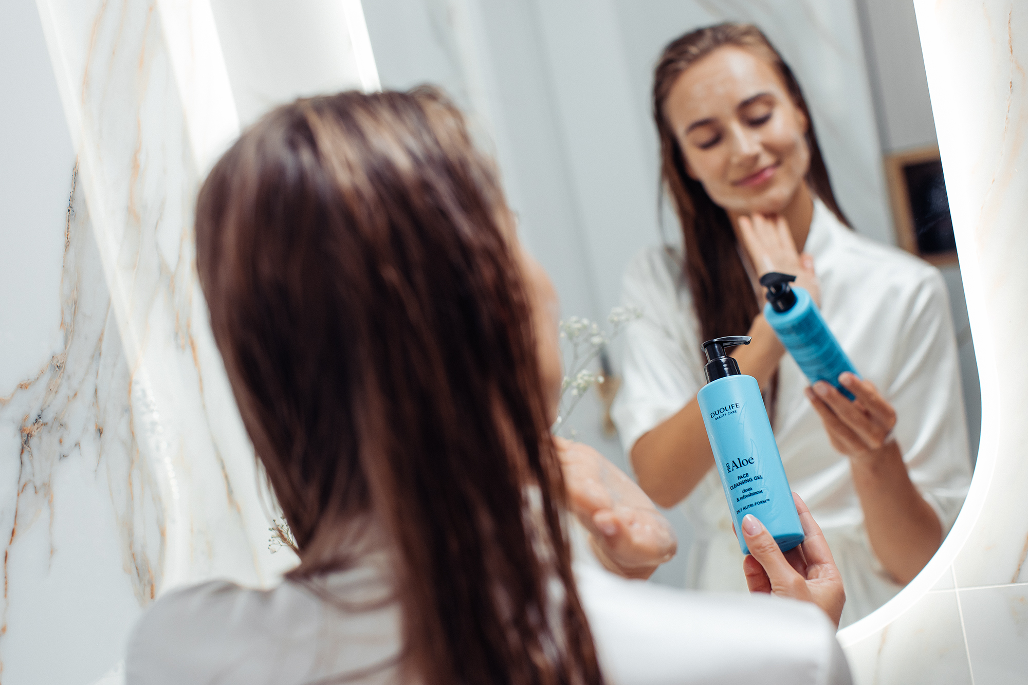 Aplică gelul pe fața umedă și masează ușor cu mișcări circulare, evitând zona ochilor.